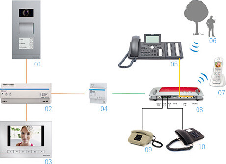 Video-Türsprechanlage mit Monitor, Telefon und Netzwerkgeräten im Haushalt