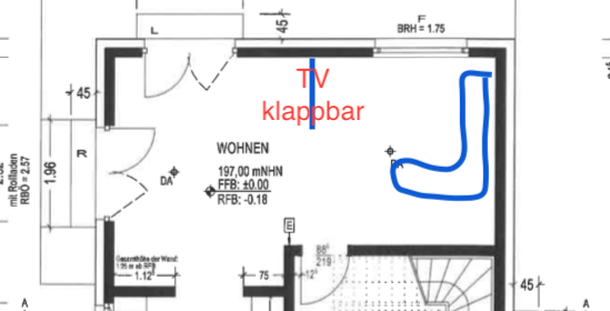 So wie es Andre77 vorschlägt würde ich es auch machen. So ähnlich haben wir es auch - an der Wand neben dem Fenster ist ein Regal mit den ganzen Gerätschaften, daran ist der TV an einem Schwenkarm. Weiter hinten - in deinem Grundriss wäre das bei den beiden Terrassentüren - haben wir noch eine Leinwand zum Ausfahren und über der Couch einen Beamer. Sehr genial für Kinoabende