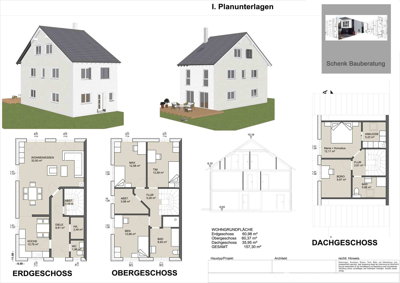 Hast du da einen Link hier im Forum zur Hand? Nein, weil ich die Zeichnung noch nicht öffentlich gestellt habe. Da ja aber Niemand wissen kann, wo das BV zu finden ist, setze ich die Pläne in den Anhang. Konzipiert für 5 Personen, leben mittlerweile 6 Menschen im Haus; weiterer Nachwuchs - infolge Mädchenmangel - nicht ausgeschlossen.Real haben wir noch etwas mit der Farbe gespielt und Mauerwerk wie Fenster als Eyecatcher eingesetzt; beispielhaft findest Du das Fenster neben der Garage