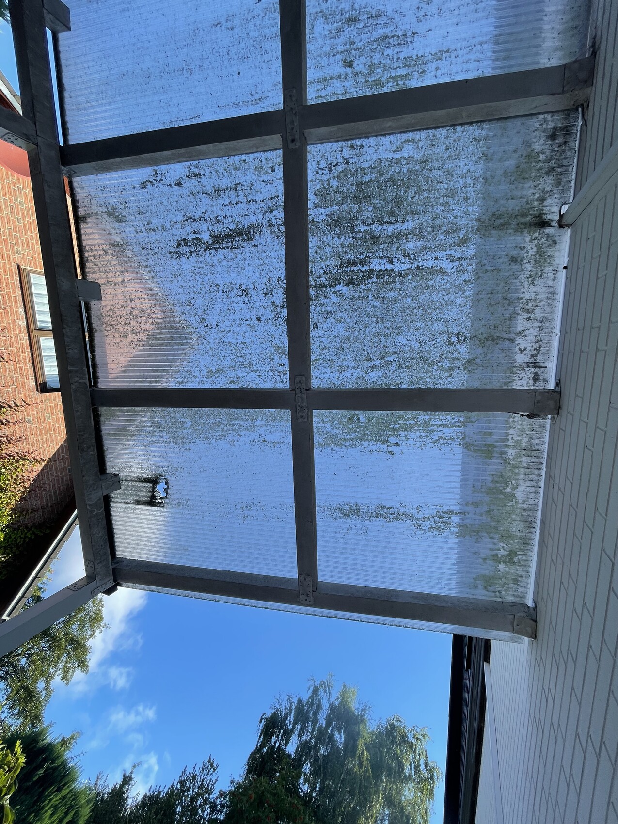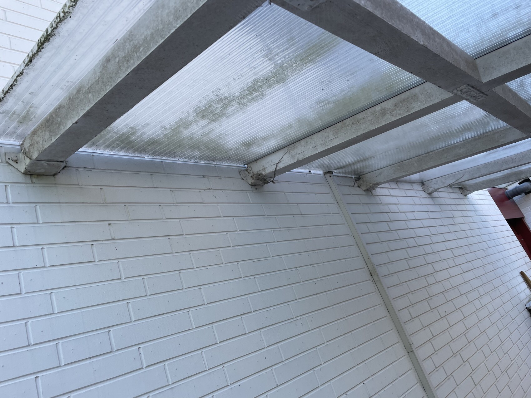 Status aktuell: Überdachung mit Stegplatten auf Längsbalken (80x80) mit Balkenschuhen an der Hauswand befestigt.