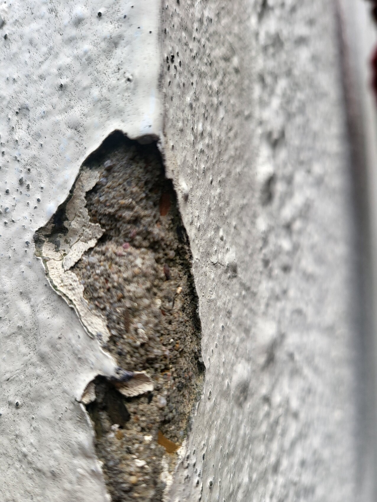 Beschädigte Betonwand mit Loch; Innenseite zeigt Kies und Sand.