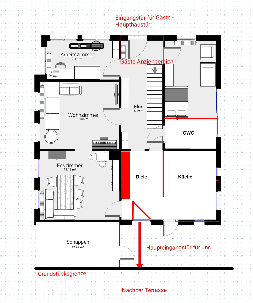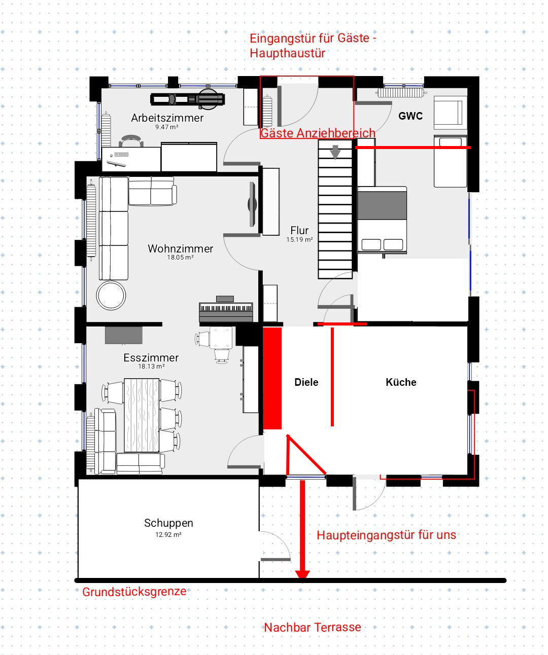 Wenn wir im Sommer mit Freunden auf der Terrasse sitzen, dann muss jeder, der ins Bad geht Fenster bei Eintritt schließen und nach dem Geschäft öffnen. Oder halt Geräusch- und Geruchskulisse für die Anwesenden erzeugen...Das hatte ich auch schon gedacht. Das ist Schade. Innen finde ich die Variante dennoch am besten. Wäre Terrasse verlegen eine Option?Oder kann man das Gäste-WC auf die andre Seite schieben? Sind da Leitungen denkbar? Das wäre dann natürlich noch besser.