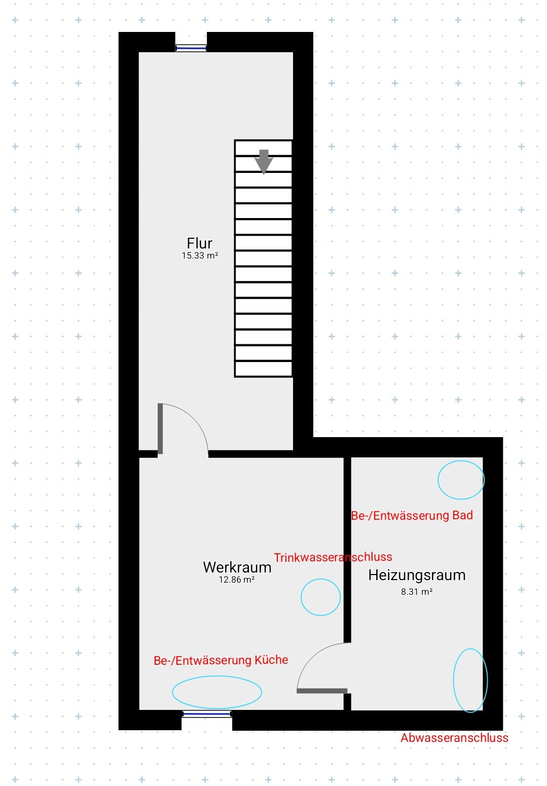 Die Wasserleitungen laufen alle durch das Gäste Bad / Küche und kommen aus dem Keller. Anbei eingezeichnet im Kellerplan.