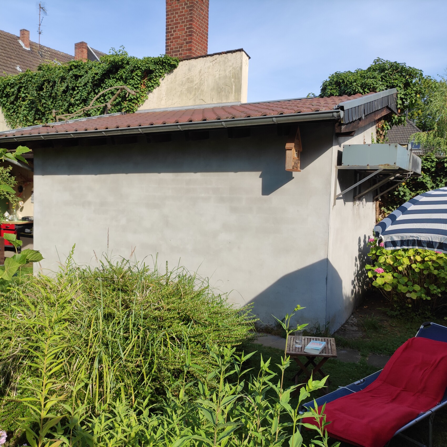 Ich möchte dann in der langen Wand auf dem Foto ein Fenster haben sowie entweder in dieser Wand oder an der Querwand links eine - dann vom Garten aus - begehbare Tür.