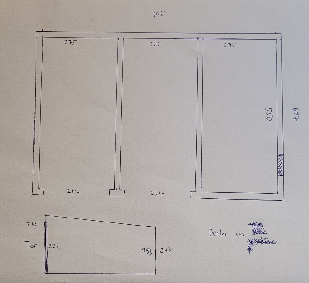 Wir haben zwei Garagen plus Schuppen nebeneinander. Ich hab mal eine kleine Zeichnung mit beigefügt.