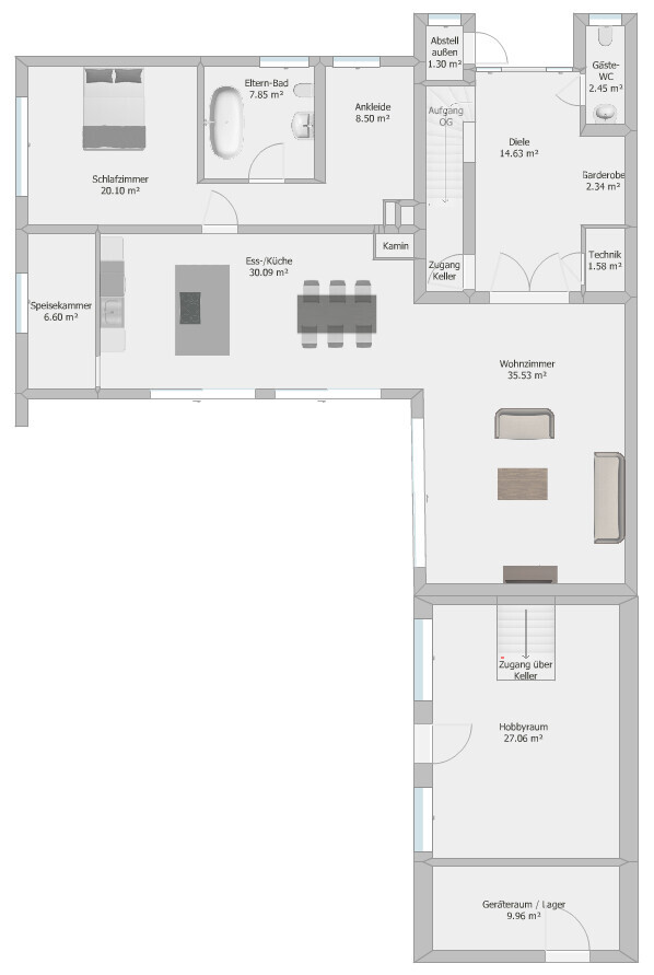 Die neue Aufteilung im EG entspricht beinahe unserer Planung, die ich hier vor 1,5 Jahren mal geteilt habe. Den finalen Grundriss des EG füge ich mal anbei. Wollte später mal ein paar Fotos machen, fehlt aber noch einiges an Einrichtung/Kleinkrams.