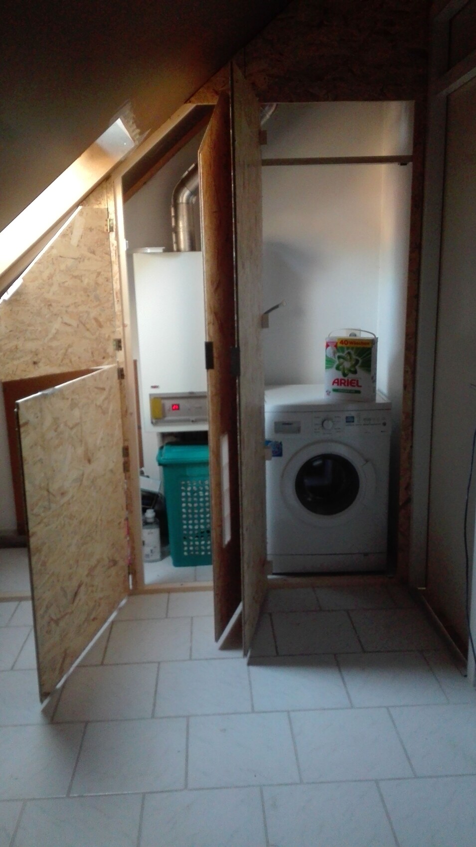 da wir in unserem Haus mehr Wohnraum schaffen mussten, haben wir den Hauswirtschaftsraum zu einem Gäste bzw. Arbeitszimmer umgewandelt. Der Raum ist ca. 10 m2 gross und hat ein kleines Davhfenster drin. In dem Hauswirtschaftsraum sind neben Waschmaschine und Trockner auch die Gastherme(raumluftabhängig) verbaut. Damit alle drei Geräte nicht sichtbar sind habe ich das ganze umbaut.