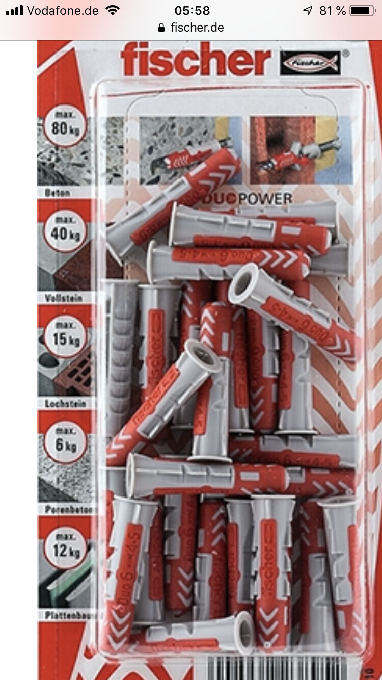 Ich möchte den „Standard“ bzw. das Befestigungsmaterial nehmen, welches z.B. beim Möbelstück mitgeliefert wird.Ich glaube ich hab noch nie die Dübel benutzt, die dabei liegen. Meist sehen die immer viel fragiler aus gegenüber über der Fischer Variante.
