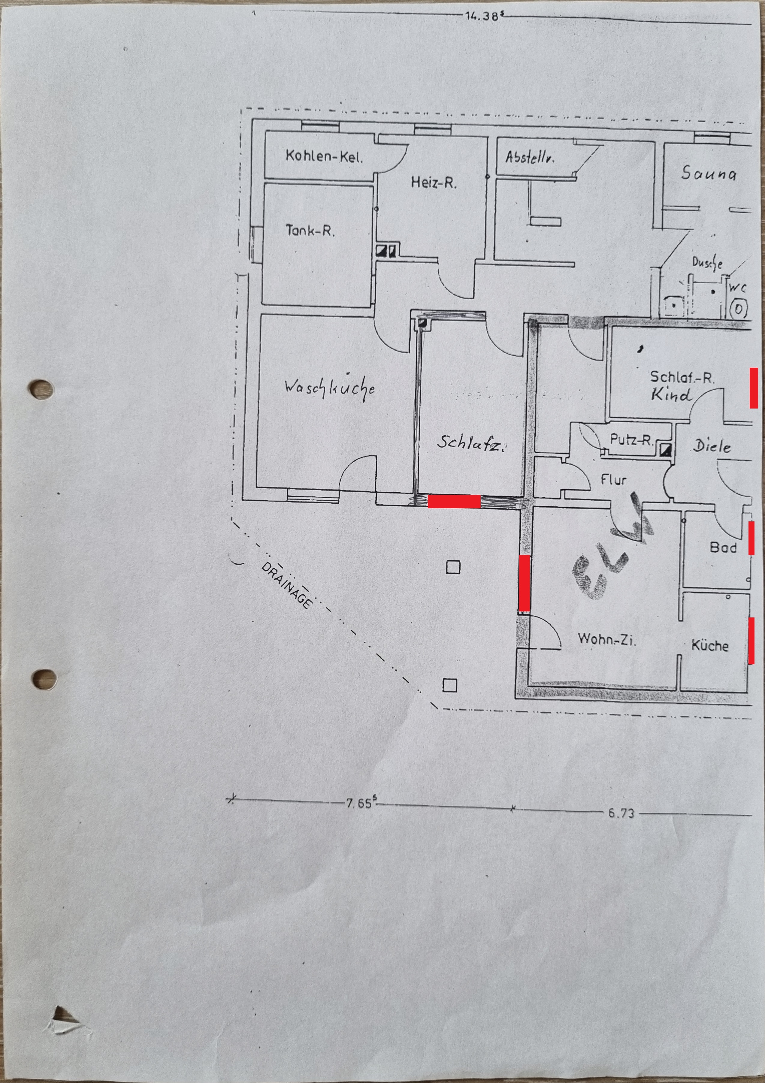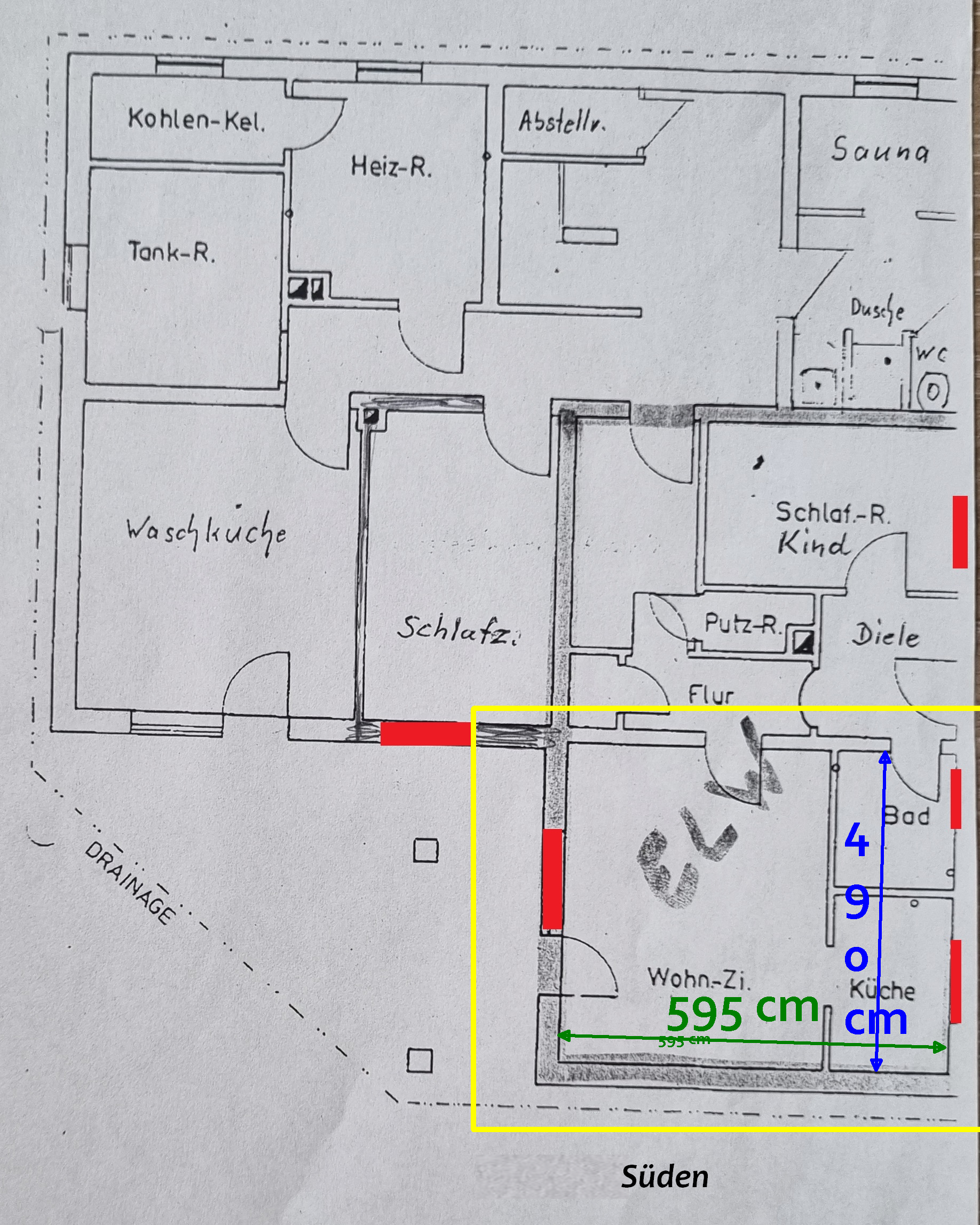 Das (größere) Schlafzimmer wurde bereits vor einigen Jahren durch einen Wanddurchbruch zum Flur in die Einliegerwohnung integriert und der ursprüngliche Zugang verschlossen. Vom Untergeschoss liegt uns leider nur dieser Grundriss vor. Durch die Hanglage liegt die Einliegerwohnung nur zum Teil unter der Erdoberfläche und hat dadurch "normal" große Fenster und einen Terrassenzugang. Die Fenster habe ich rot markiert, da diese im Plan kaum und zum Teil gar nicht zu erkennen waren. "Oben" im Bild ist Norden, demnach befinden sich in der Südwand tatsächlich keine Fenster. An der Innenwand gemessen würden die Maße des neuen Wohn- und Essbereichs 5,95m x 4,90m betragen. Nicht die Welt, aber hoffentlich ausreichend groß.