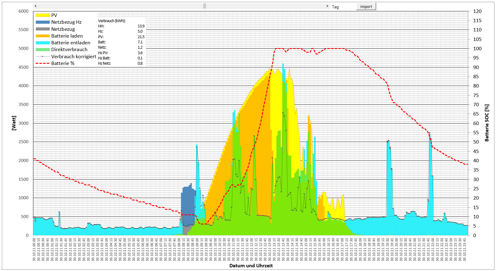 Hier ist mal ein Beispielchart aus meinen Logs von Ende Oktober. Da habe ich schon mit den Wärmepumpendaten den Hausverbrauch in Hausstrom (unter der feinen Linie mit Strich-Markern "Verbrauch korrigiert") und Wärmepumpenstrom (dunkelblau bei Netzbezug, sonst grün bzw. türkis über der feinen Linie) getrennt. Die akkumulierten Angaben in der Box neben der Legende stimmen noch nicht ganz, da irgendwo noch ein Wert nicht einfließt. Die Korrektur in der Verbrauchslinie beinhaltet neben der Trennung der Verbraucher auch noch eine Korrektur des vom Smartmeter erfassten Hausverbrauchs, was man bei großen Anteilen Photovoltaik-Überschuss (gelb) sieht, wo der Direktverbrauch unter die schwarze Linie sackt. Teilw. sind das 200+ W. Da das sowohl einen rel. konstanten Anteil hat, als auch einen prozentualen von der eingespeisten Leistung (Wandlungsverluste?), kann ich das rechnerisch gut korrigieren, was ich in Urlaubszeiten bei konstantem Hausverbrauch gut validieren konnte.