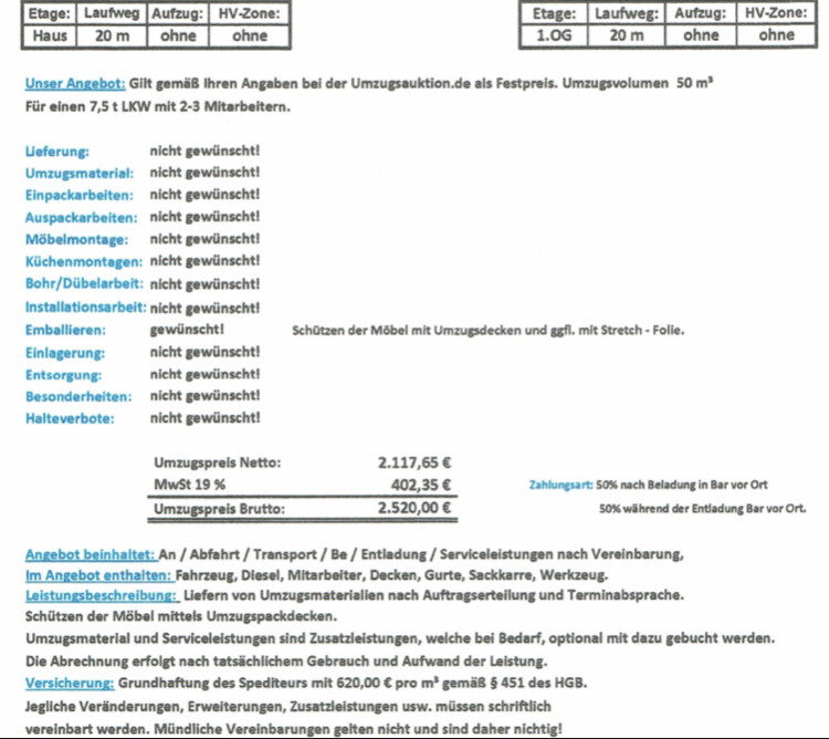 Das initiale Angebot lag bei knapp über 2000 Euro. Da wir dann doch mehr Kram hatten als anfangs angegeben/gedacht (unterschätzt man halt gefühlt immer), korrigierten sie das Angebot nach oben auf 2520 Euro.