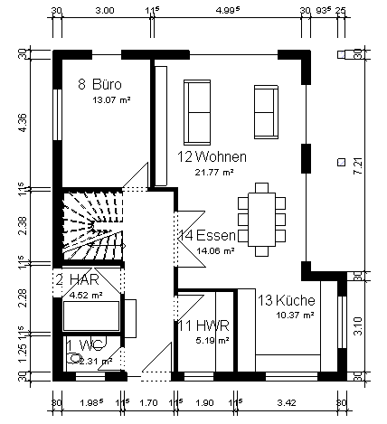 Der Flur ist zu lang und verwinkelt... ich würde wohl die Treppe weiter Richtung Eingang setzen (etwa 65 cm), WC auf die Treppenseite direkt an die Eingangstürwand, dann HAR für Technik, dann Treppe, dann Hauswirtschaftsraum für Wäsche (wobei das wohl etwas eng wird). Bad im OG wird dann kleiner - ist bei einer vernünftigen Aufteilung aber auch kein Problem. Würde die Bad OG Wand mit der Schlafzimmerwand fluchten (das sind dann genau die ~65 cm), Kinderzimmer entsprechend größer ziehen, Ankleide kleiner und Zugang vom Flur aus - Dachfenster rein, Schränke rechts und Links. Ihr habt doch sowieso noch eine Schrankwand im Schlafzimmer. Ungefähr klar was ich meine? Sonst skizziere ich nachher noch mal...Gute Tipps! Danke!