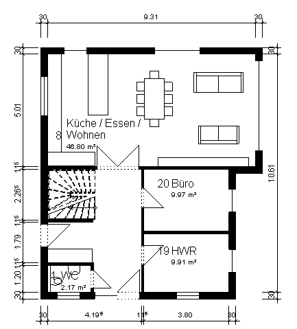 Wenn man sich die Ankleide spart wäre Platz für das Bureau im OG. Oder man könnte die Waschmaschine anderswo unterbringen und den Hauswirtschaftsraum kleiner machen.