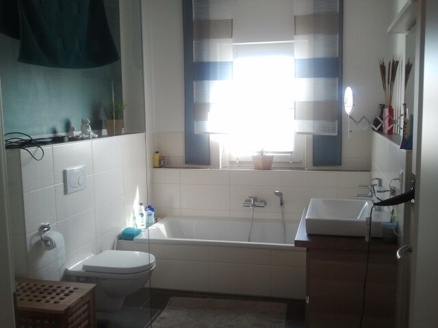 Helles Badezimmer mit Badewanne, Toilette, Waschbecken und Fenster mit Rollläden