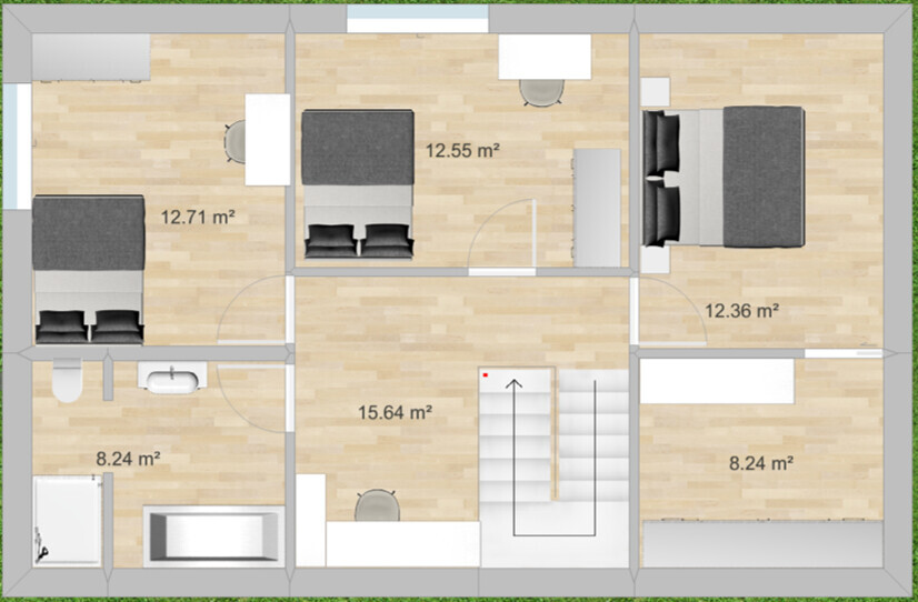 Der Flur oben ist in der Tat sehr groß und ich würde ihn gern zugunsten der Zimmer verkleinern. Allerdings kriege ich das nicht hin, damit das mit den Türen vom Flur aus noch hinhaut...vielleicht hab ich da n Brett vorm Kopf. Ein großes Badezimmer ist uns übrigens auch nicht sonderlich wichtig. Für uns ist das eher ein funktionaler Raum, der natürlich durch schöne Materialien trotzdem so gestaltet sein soll, dass man sich wohlfühlt. Mit dem großen Flur oben hat man da natürlich mal n bisschen Freifläche für ne Topfpflanze und die Yogamatte meines Freundes .