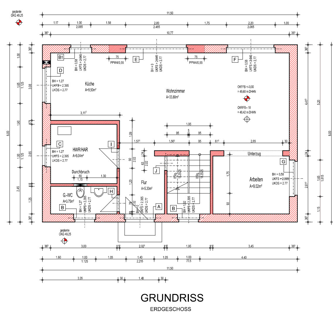 Von einigen Dingen haben wir uns aber auch aus Kostengründen verabschiedet. Tatsächlich von der höheren Decke im EG, diese haben wir nun auf 2,60 belassen, genauso wie im OG. Die Fassade wird nun geputzt, Holz- oder Riemchenverblendung haben wir uns dann doch gespart, auch wenn ich dem ein bisschen hinterhertrauere. Aber häufiger sehe ich das Haus von innen und da möchte v.a. bei Bodenbelägen, Armaturen, Türen weniger Kompromisse machen müssen als bei der Außengestaltung. Dafür haben wir die Grundfläche nochmal geringfügig vergrößert von 11,5x7,5 auf 11,5x8 m, sodass rechnerisch die Wohnfläche jetzt 142 m² beträgt. Einige Fenster haben wir noch vergrößert bzw. hinzu geplant.