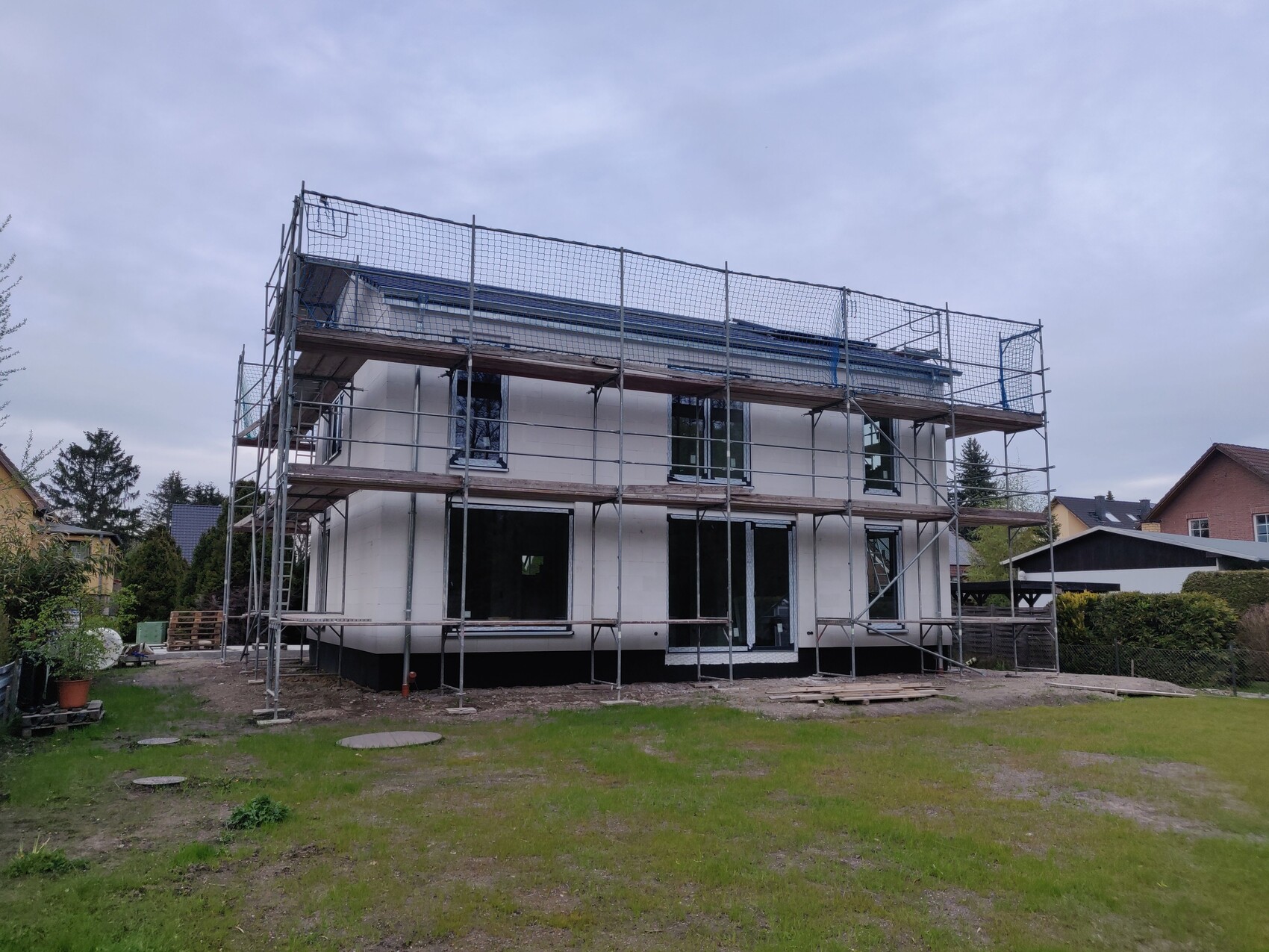 Zweistöckiges Haus mit weißer Fassade, von Baugerüsten umgeben; Bauarbeiten im Garten.