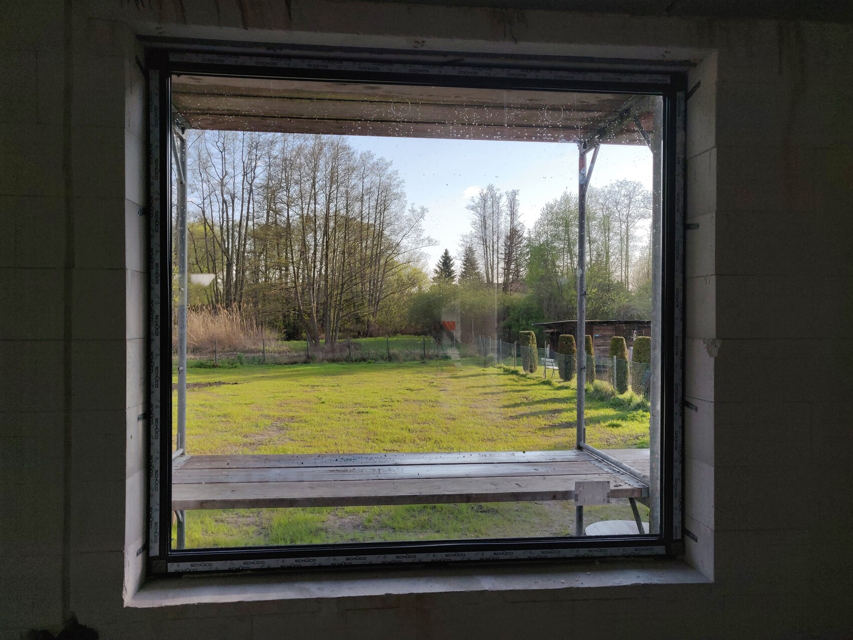 Blick aus unfertigem Innenraum durch offenes Fenster auf grüne Wiese, Bäume, Zaun und Holzbank.