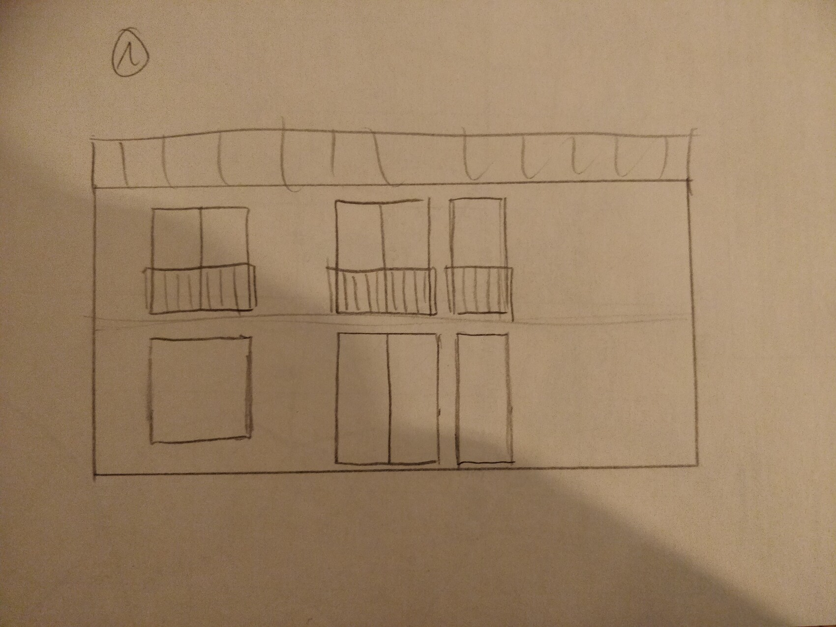 Skizze eines rechteckigen Gebäudes mit Dach; obere Fenster mit Balkone, unten Türen.
