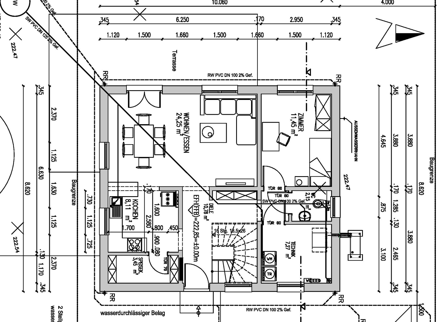 Nur als Tipp und hat nichts mit dem Grundriss zu tun. Ich würde die Position des Außenwasserhahns ändern und diesen entweder in die Außenwand vom WC oder vom Hauswirtschaftsraum nehmen. Die Schmutzwasserleitung einmal quer unter dem Haus durch wäre definitiv nicht meins, Abwasser würde ich immer auf dem kürzesten Weg nach draußen legen, auch wenn es draußen dann bisschen länger wird, unterm Haus kommst du da nie wieder ran, oder sehe ich das in den Plänen falsch?
