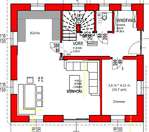 Habt ihr euch schon Gedanken gemacht, wie die Küche später aussehen soll? So wie auf dem Plan oben gibt es ja nur eine kleine Küchenzeile ohne Möglichkeit der Lagerung. Im EG befindet sich auch kein Abstellraum, d.h. ihr müsste das meiste im Keller lagern. Ist nicht schlimm, wir haben im EG auch keinen Abstellraum vorgesehen.