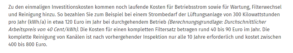 Meine Stammtischparolen bezüglich Kosten stammen mal eben von der Verbraucherzentrale! Google hilft!Die Verbraucherzentrale NRW schreibt nur, dass eine Kontrollierte-Wohnraumlüftung empfehlenswert ist. Da steht nix von Verkeimung.Aber ja, es gibt einen Hinweis zu den Kosten (siehe Text). Diese sind allerdings sehr individuell. Strom kann man selbst berechnen, Filter selbst tauschen/zurechtschneiden (ich bezahle einen kleinen einstelligen €-Betrag p.a. für selbst gekaufte Filtermatten, die ich selbst schneide inkl. Pollenfilter als Allergiker). Die Reinigung ist nach Bedarf - wenn die Kontrollierte-Wohnraumlüftung regelmäßig läuft, ist der Bedarf auch gerne nach 10 Jahren noch nicht gegeben (aus Erfahrung).