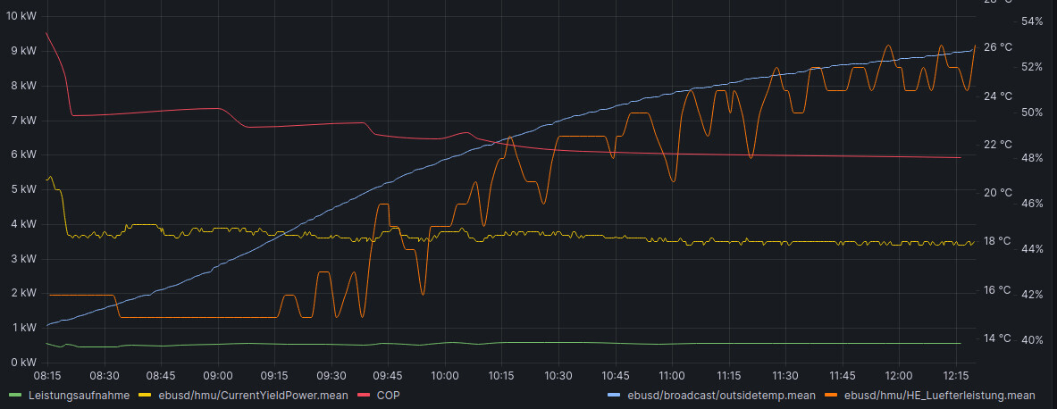 Zeitreihe von Leistungsaufnahme, CurrentYieldPower, COP, Außentemp, Lüfterleistung; 08:15–12:15.