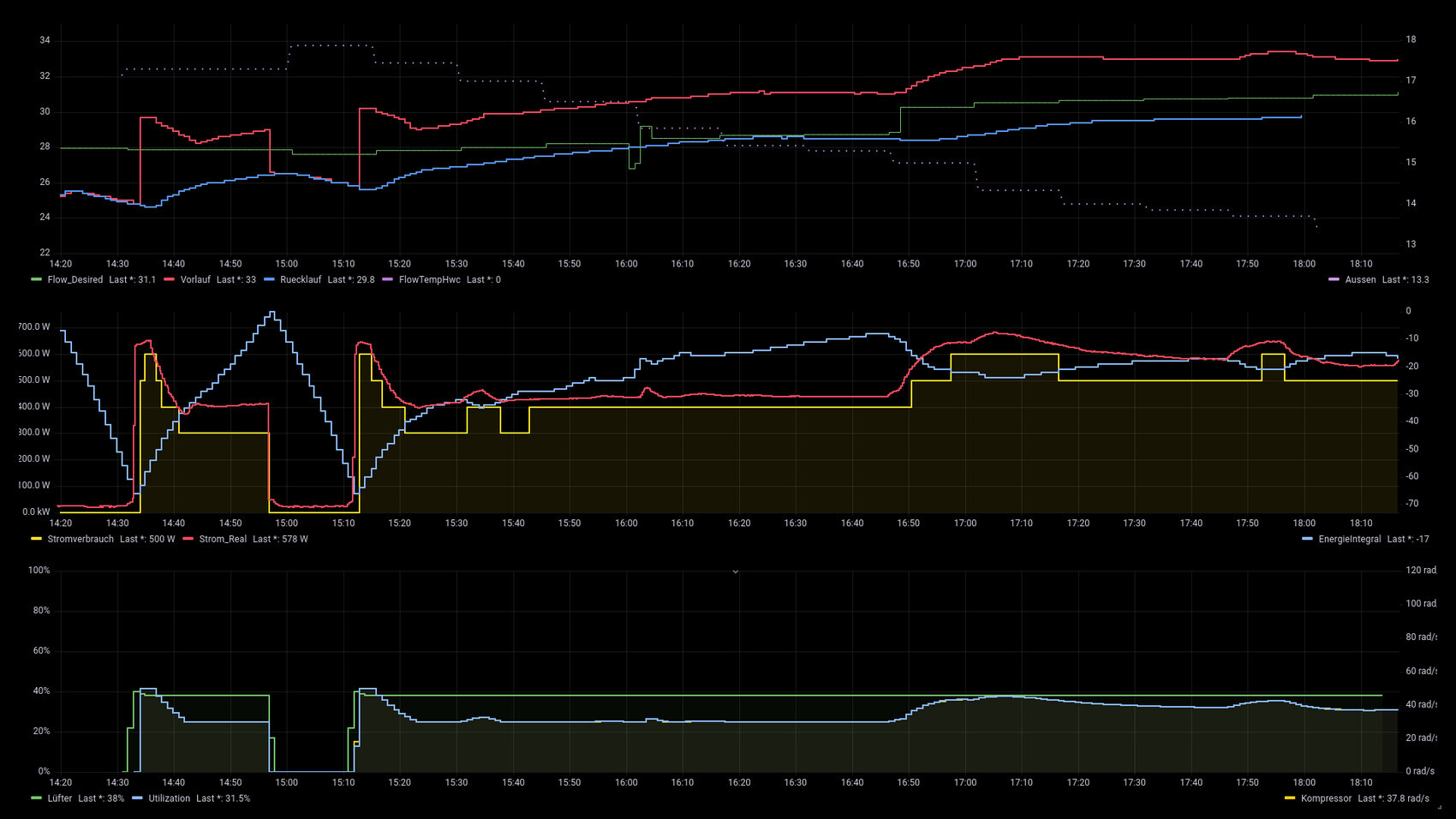 Hier mal eine Sequenz von heute mit 60% Flüstermodus aktiv. Man sieht, dass die Kompressor Drehzahl nicht über 50 geht. Beim Stromverbrauch sieht man auch, wie ungenau die Werte von der Wärmepumpe sind. In Rot ist der reale Verbrauch den ich über kalibrierte Messfühler sammle.