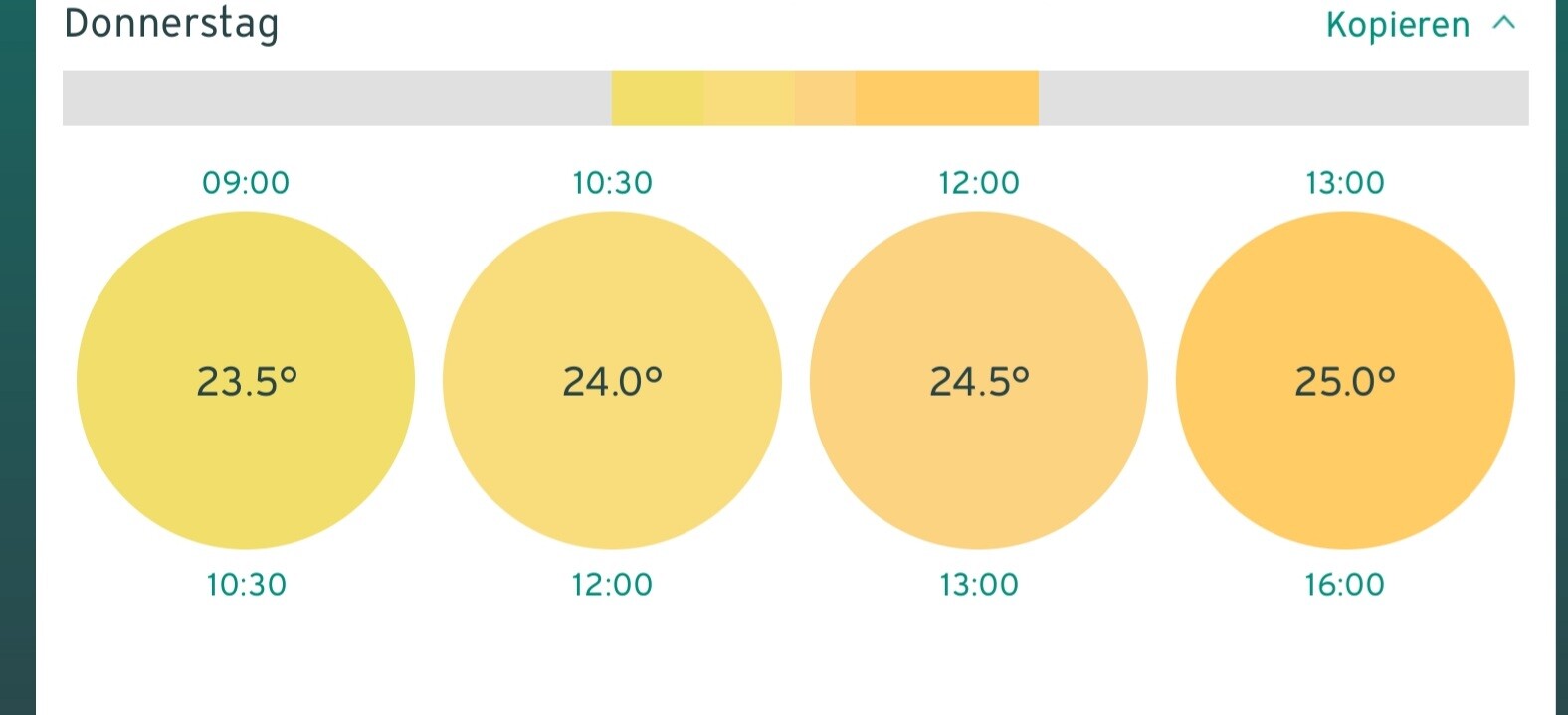 Ich verstehe deine Frage nicht genau. In meiner Darstellung erkennst du meine eingestellte Zeiten und Temperaturen. Mehr ist da (für mich) nicht zu tun.Haha, habe in der kleinen Vorschau irgendwie nicht damit gerechnet, dass auf dem Chart die Temperaturen dargestellt sind. Genau das, Danke!