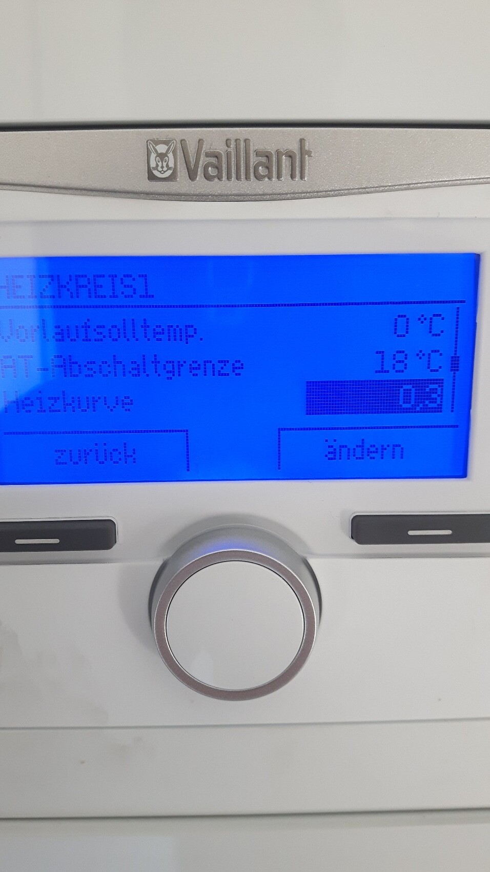Vaillant Heizungssteuerung mit blauem Display und Rundknopf.
