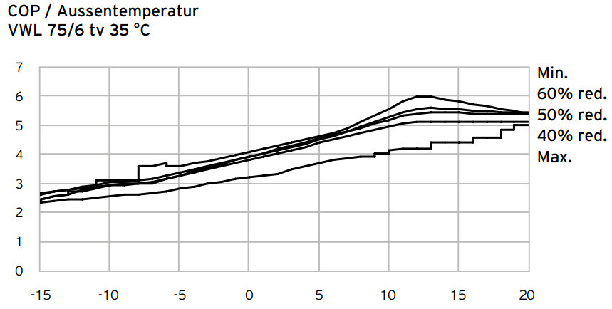 Wenn man bei 2-3 als COP bei Plusgraden landet, dann muss da gewaltig etwas falsch laufen. Ich erinnere an den COP Chart für 35° Vorlauf (bei uns notwendig für -12 Grad!). Selbst bei -12° lande ich bei 2,5-3 als COP.