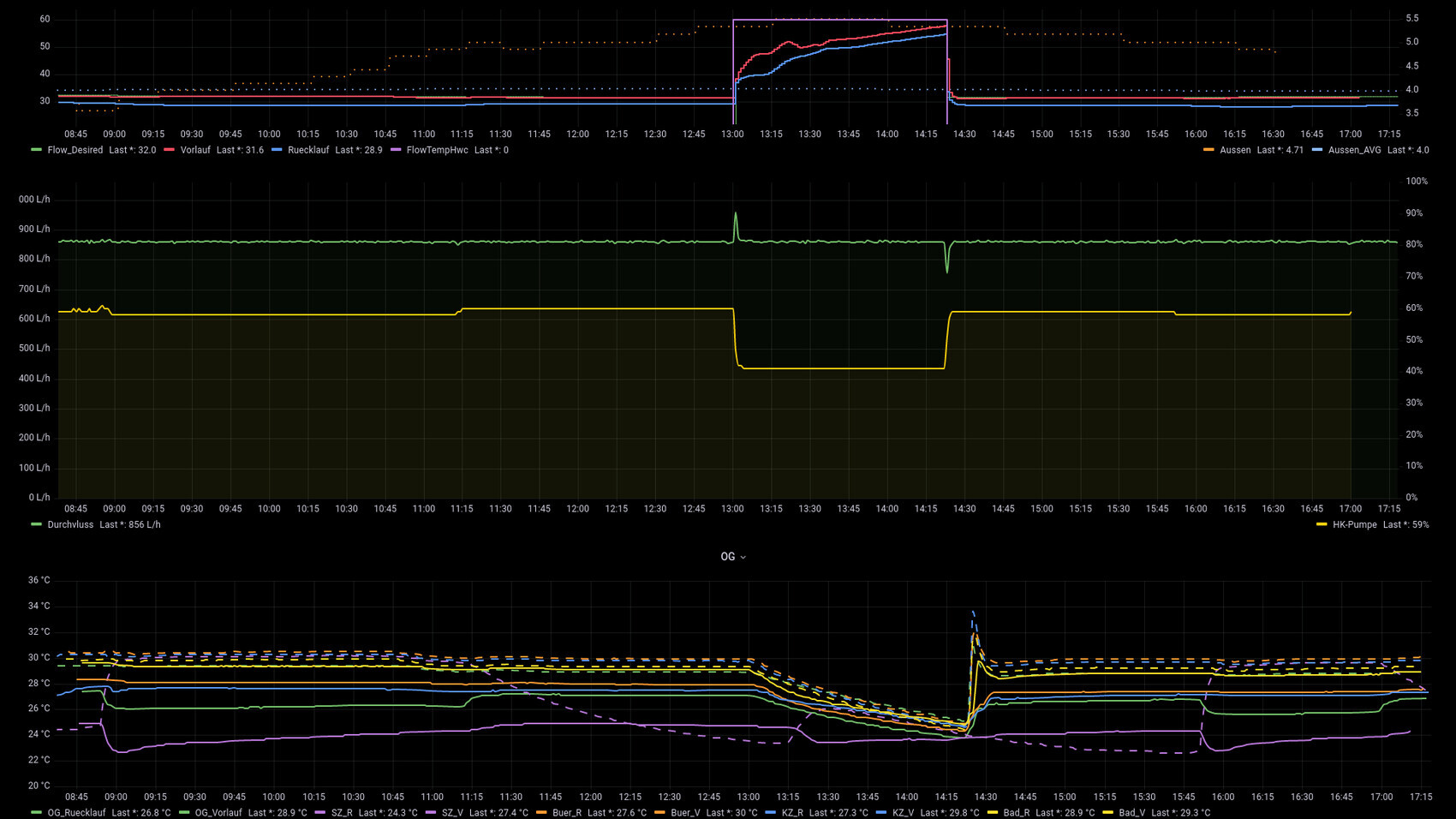 Meinst du ggf. den erhöhten Druck, sobald ein Kreis zugeht und deshalb muss die Pumpe höher drehen?Evtl. hilft ja die Grafik hier. Die untere Grafik zeigt die Temperaturen am Heizkreisverteiler (Vorlauf/Rücklauf für jeden Kreis).9:00 Heizkreis Schlafzimmer geht zu, 11:15 geht er wieder auf usw. Zwischen 13:00 und 14:25 dann Warmwasser-Bereitung, da ist der Widerstand viel kleiner, daher Pumpenleistung geringer. An den Spitzen sieht man sehr schön, wie die Pumpe sich wieder einregelt.