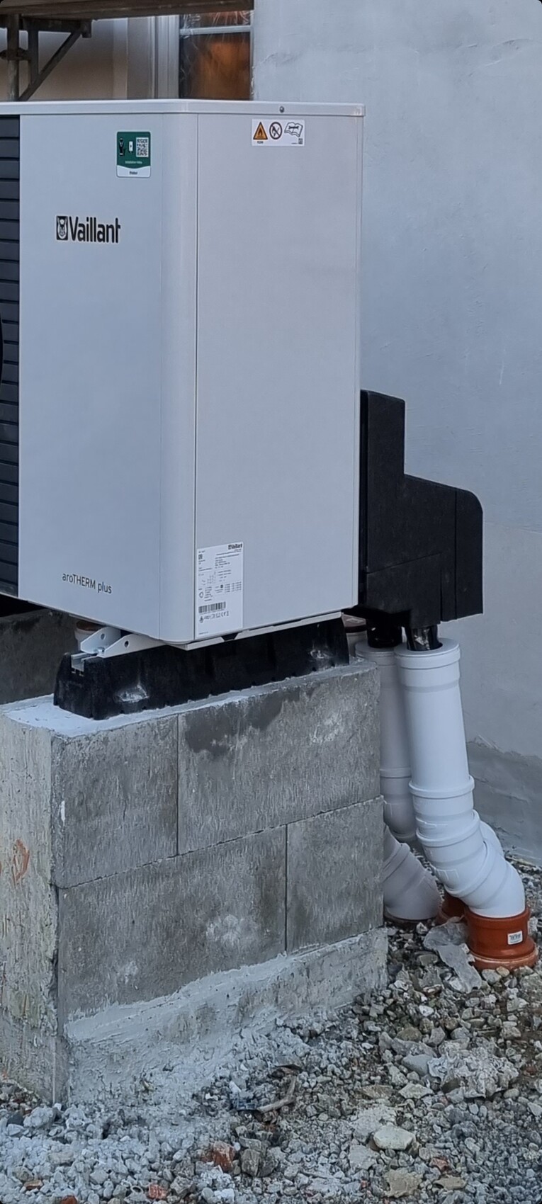 Hast du hinter der Rückwand im unteren Bereich Begrenzungen in Form von Steinen? Auf dem Foto links unten sieht es so aus (also von vorne rechts unten). Diese Abgrenzung könnte die gleichmäßige Ansaugung am Lufteintrittsgitter behindern.Keine Abgrenzungen, keine Umrandungen. Davor Pflaster, da drunter Kies.Das graue ist der "Dämmkasten" von Vaillant für die Anschlüsse.