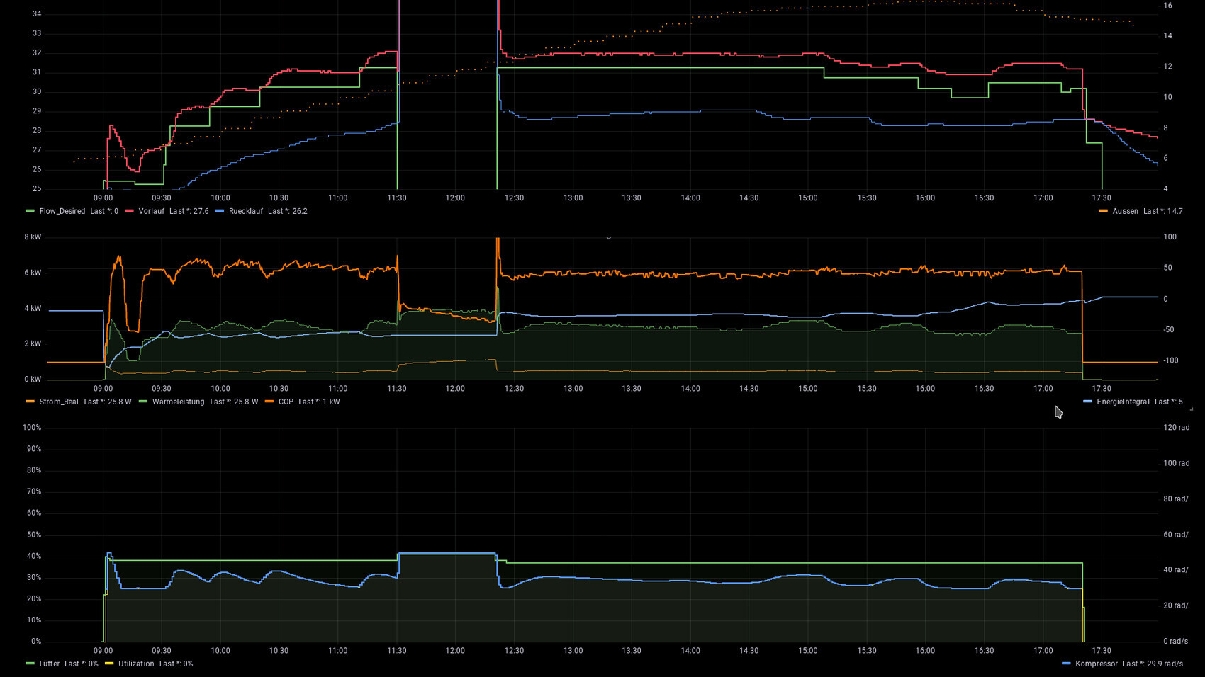 Berechnung der Kälte/WärmeleistungDie abgegebene Wärmeleistung im Moment entspricht immer recht genau Kälteleistung + elektrischer Leistung. Das gilt als geklärt. Sprich: Die Kälteleistung im Live-Monitor ist nicht das was die Wärmepumpe an Wärme "produziert", sondern dazu kommt immer auch ein mindestens großer Teil der angegebenen elektrischen Leistung.
