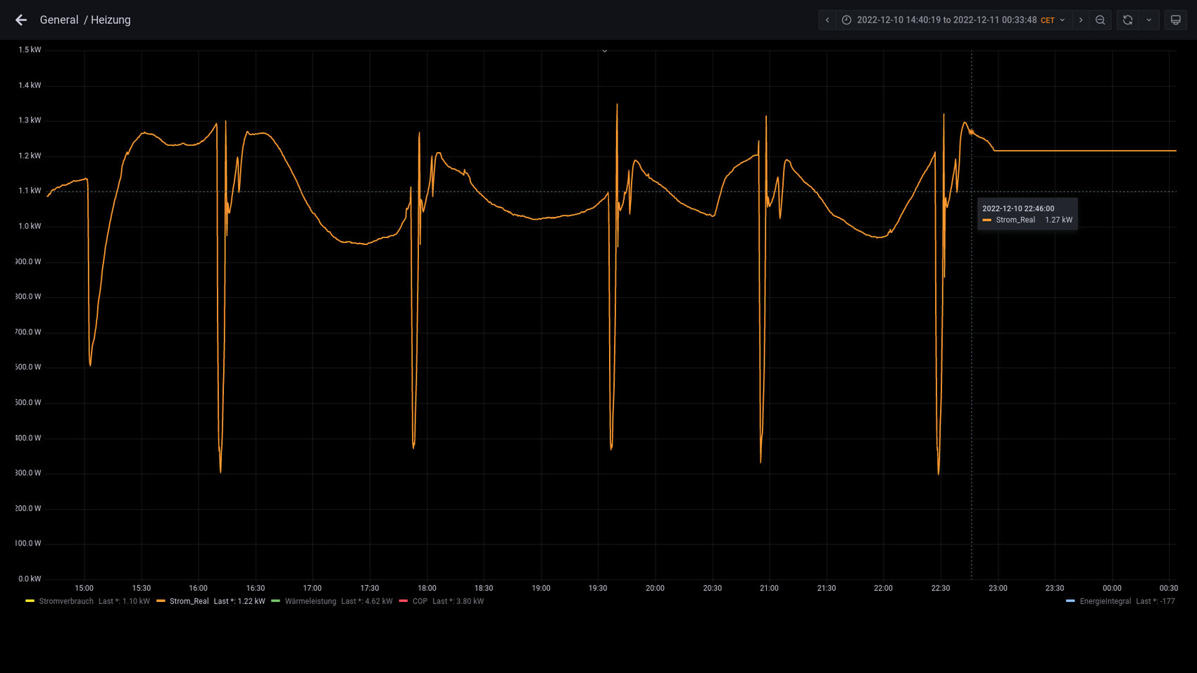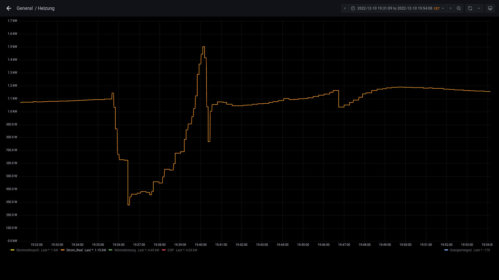 Was auch immer die Spitzen sind. Beim Enteisen entstehen nicht solche Spitzen. Ich messe den Stromverbrauch mit kalibrierten Sensoren, die Abtastrate beträgt 1 Sekunde. Bei mir sieht es beim Enteisen so aus:Zoom: