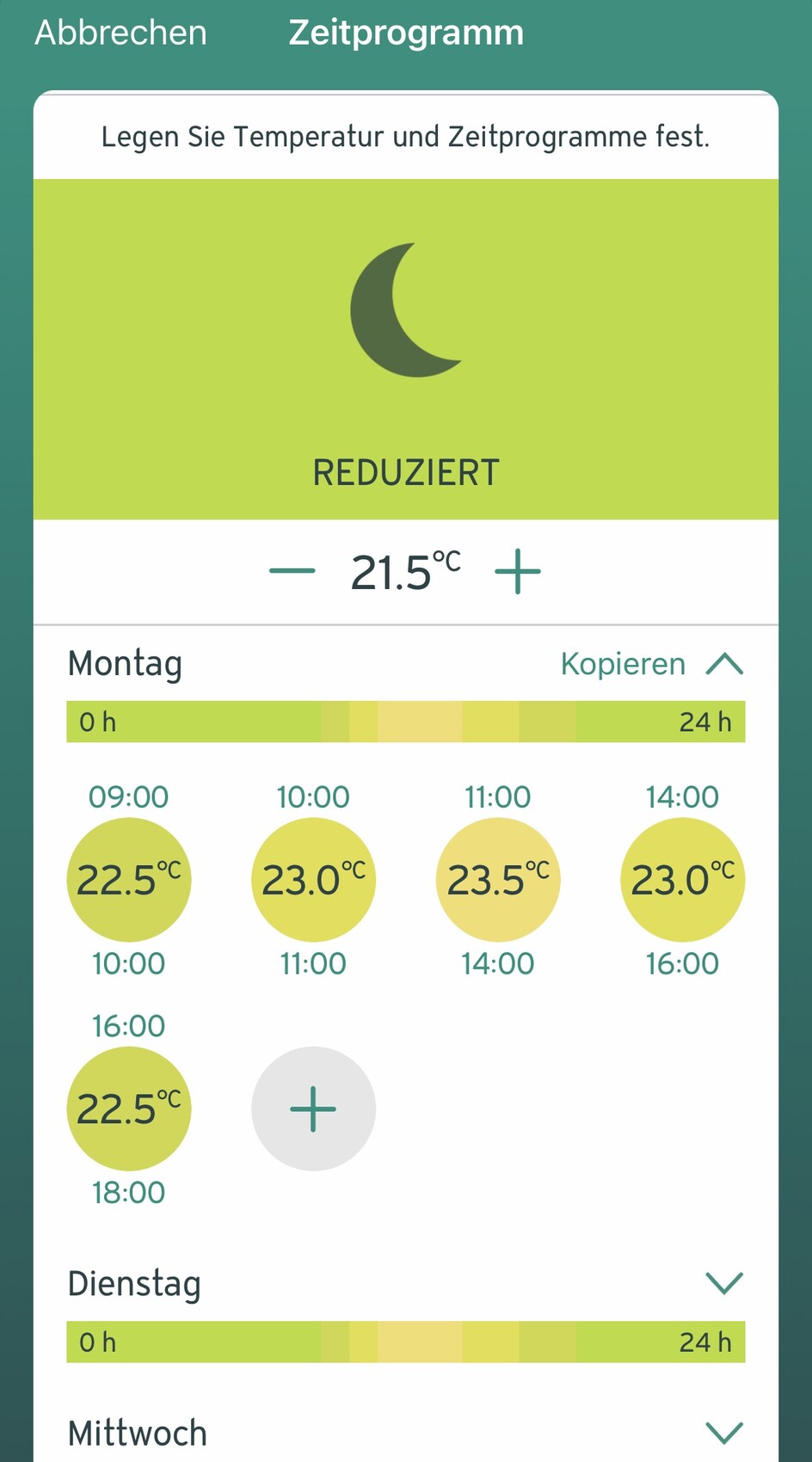 Es kühlt morgens bis auf 20-22 °C je nach Zimmer aus, daher lasse ich aktuell bis 18 Uhr noch ein wenig länger als vorher heizen.