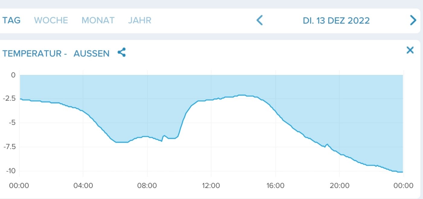 Gestern ab 15 Uhr sind bis Mitternacht die AT um ca 8° gefallen, ja nach Heizkurve steigt damit die Soll-VLT. Je höher die Heizkurve desto größer der Anstieg der Soll-VLT.