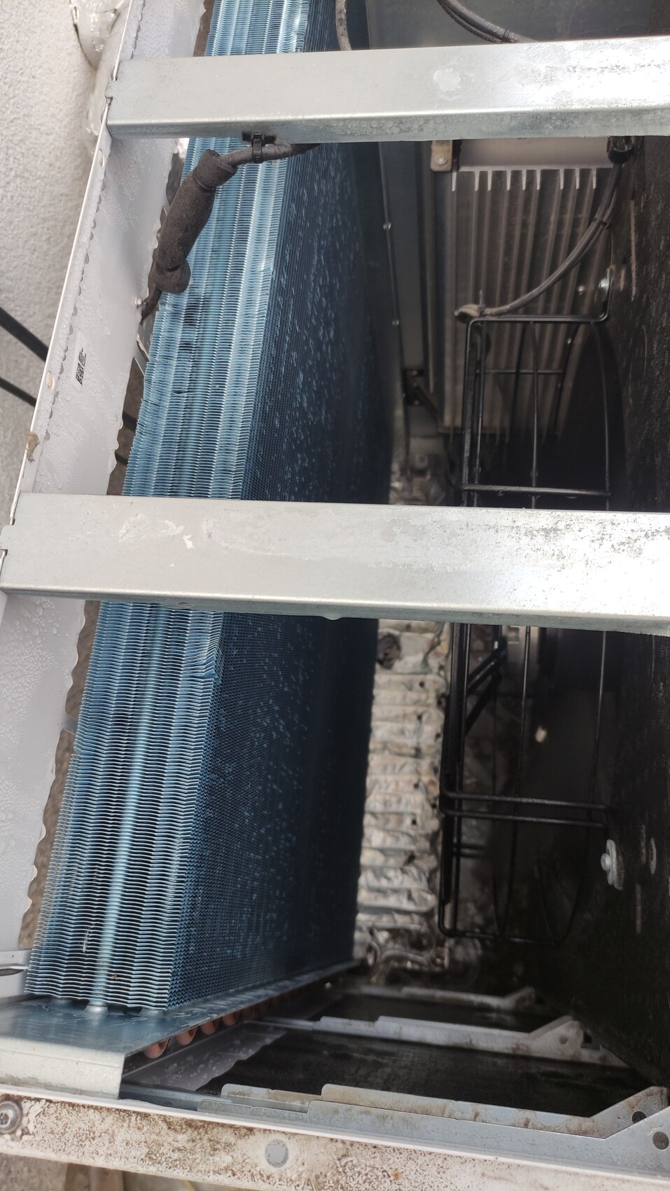 Nahaufnahme eines Klimageräts mit blauem Lamellen-Kühlkörper, Metallrahmen und Innenraum.