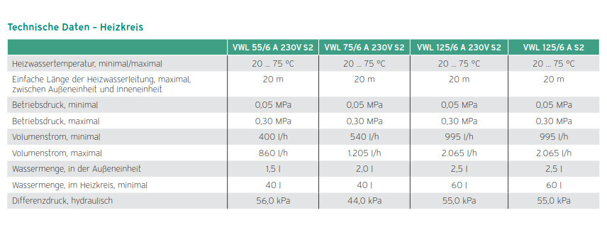 Technische Daten – Heizkreis: Temperaturbereich, Rohrlänge, Druck, Durchfluss, Wasserinhalt.