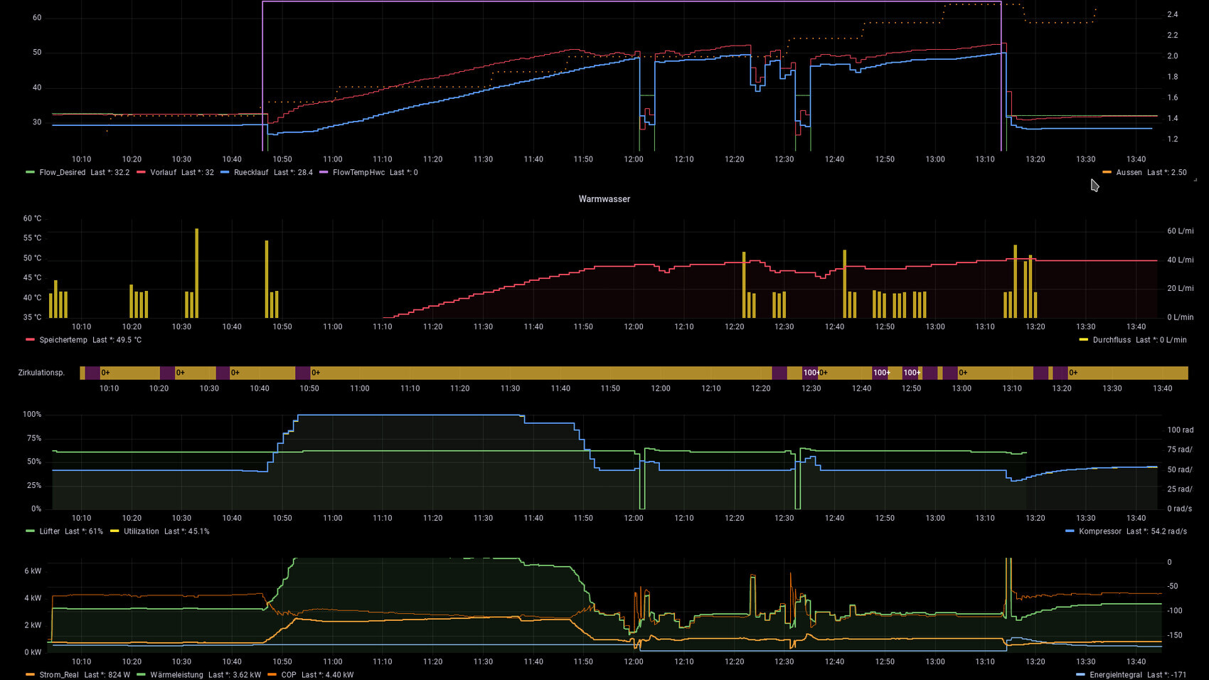 Bilder sagen ja bekanntlich mehr als tausend Worte. Wenn es zum Verständnis hilft, hier mal eine Beispiel Grafik Warmwasser-Modus war Eco, Wunschtemp 50 Offset 15K. Leider ist Gerad nicht ganz so sauber, hatte Enteisung dazwischen und Wasserzapfungen, sieht man aber in der Grafik. Das Verhalten hatte ich eigentlich schon im Wiki beschrieben. Evtl. kann man hier noch was ergänzen.