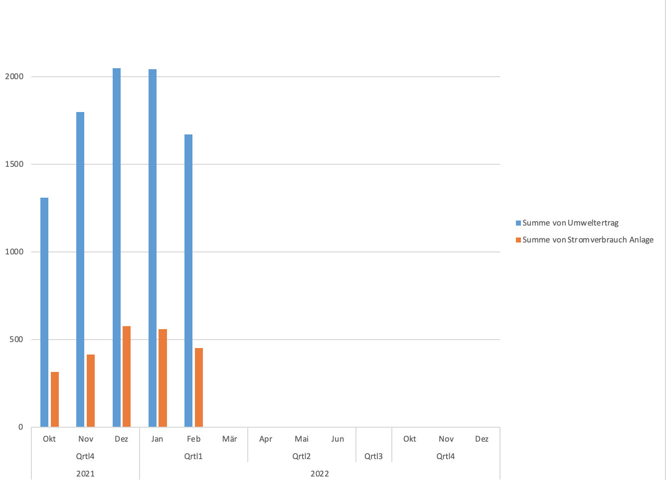Balkendiagramm: blaue Balken Umwelt­ertrag, orange Balken Stromverbrauch der Anlage (2021–2022).