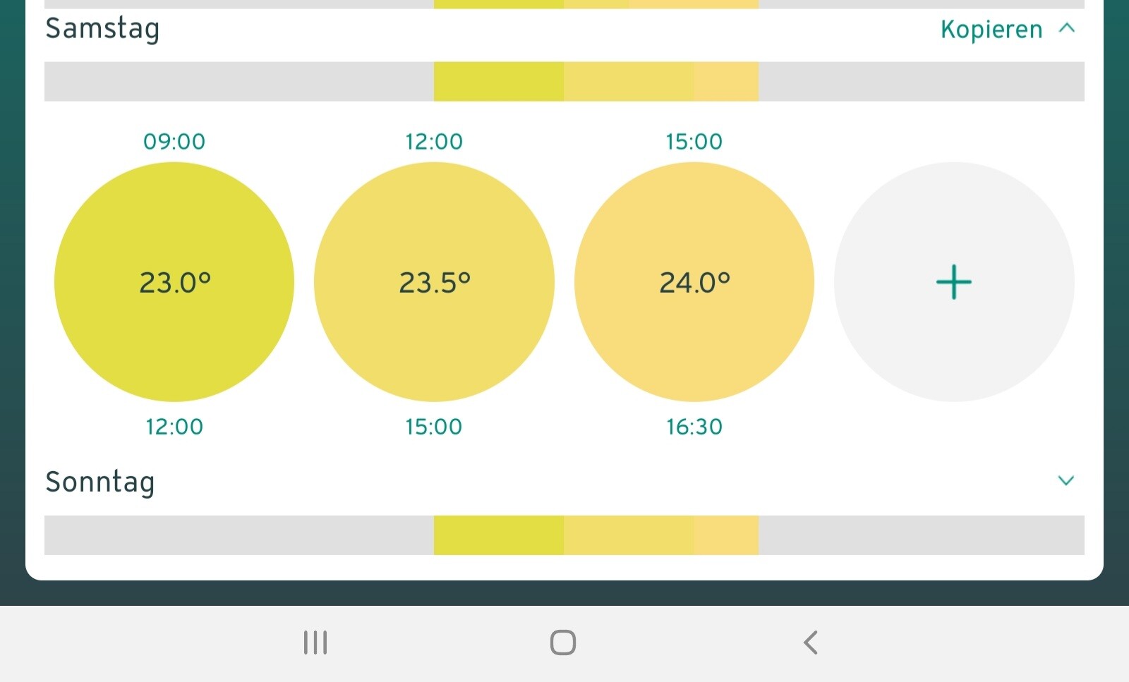 Ich schaue mir täglich oder aller 2 Tage meine Raumtemperaturen online an (Netatmo-Wetterstation). Wenn nun die Raumtemperaturen etwas das Soll unterschreiten oder überschreiten (0,5 oder 1 Grad), dann mache ich in der APP leichte Änderungen, aber nur an den Zeiten zum Start/ Ende oder Änderungen der Solltemperatur. Wenn ich etwas ändere, dann kopiere ich mir diese Einstellung gleich in der App für die nächsten Tage. Das Kopieren in der SensoApp ist wirklich eine ganz einfache Sache, dauert nur Sekunden.