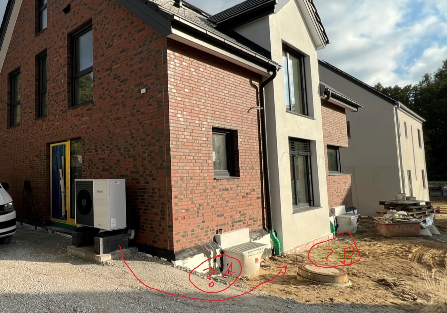 Dann unser bislang ärgerlichster Planungsfehler. Wir haben wie Wärmepumpe ja in die Einfahrt gebaut. Unser Nachbar ist davon einerseits nicht begeistert. Dass ich mir die Geräuschentwicklung geringer vorgestellt habe, hatte ich in diesem Thread schon kundgetan. Viel wichtiger ist aber, wie nervig es ist bei jedem Befahren der Einfahrt um die Wärmepumpe herumzuzirkeln. Geht zwar alles, aber ich habe echt schiss, dass irgendwer irgendwann da mal im Halbschlaf vorfährt und das Ding kaputt ist.