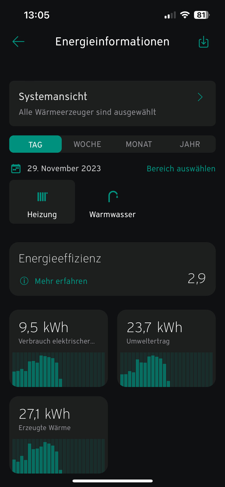 Ich wollte mal fragen ob eure myVaillant App auch merkwürdige Werte anzeigt und euer cop bei 0-2 Grad ähnlich schlecht ist wie meiner (3 und weniger). Verbrauchter Strom und Umweltertrag sind zusammen höher als der hier angezeigte Wert der erzeugten Wärme.