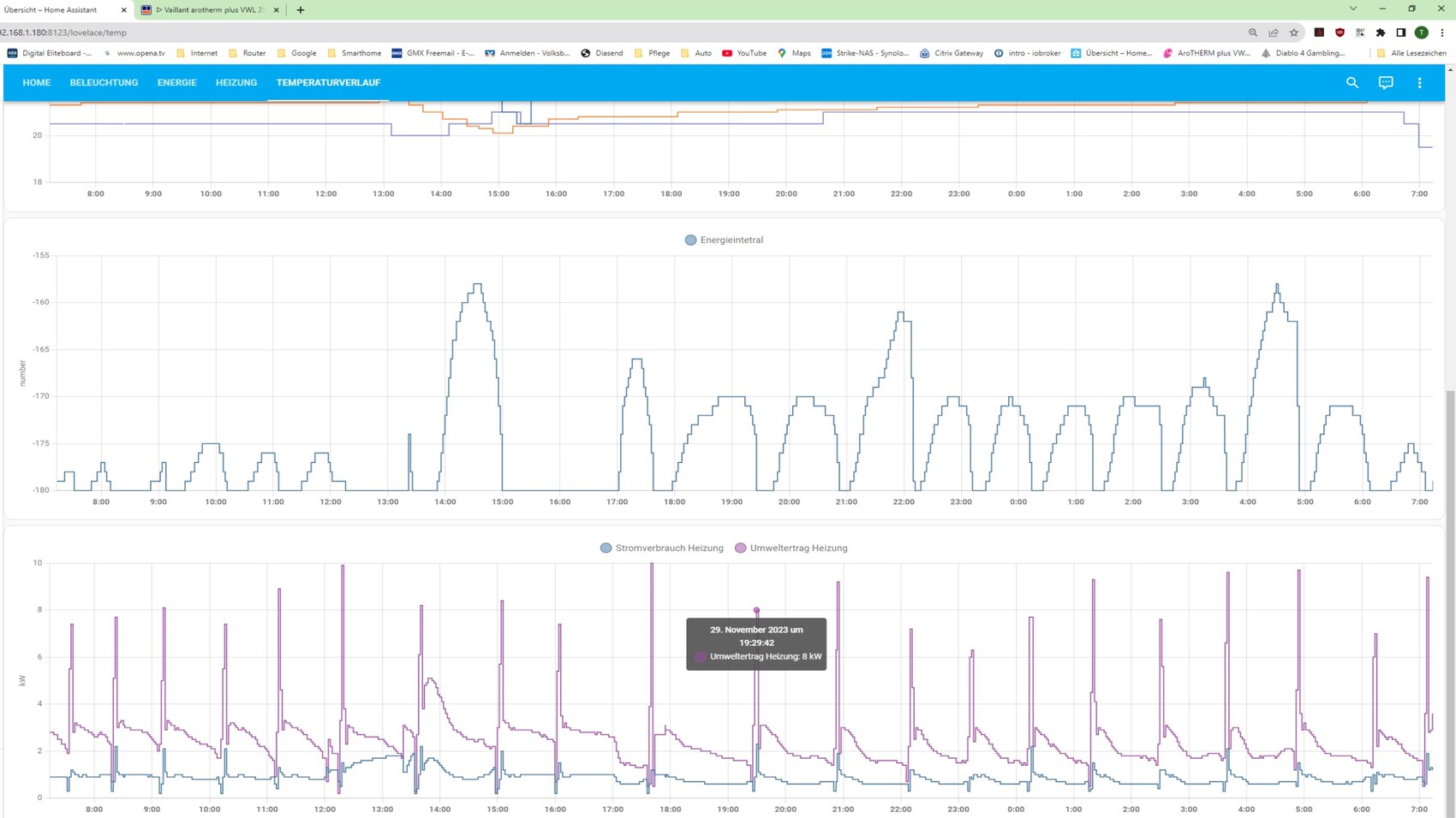 Anbei mal eine Grafik des Integrals und des Verbrauchs, daraus kam man die Enteisungen gut erkennen. Temperaturen im Haus bleiben stabil zwischen 22 und 24 Grad (nur Bad so warm).