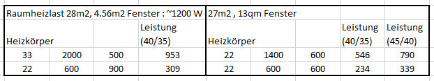Tabelle zur Heizlastplanung: Raumheizlast, Fensterflächen und Heizkörperleistungen.