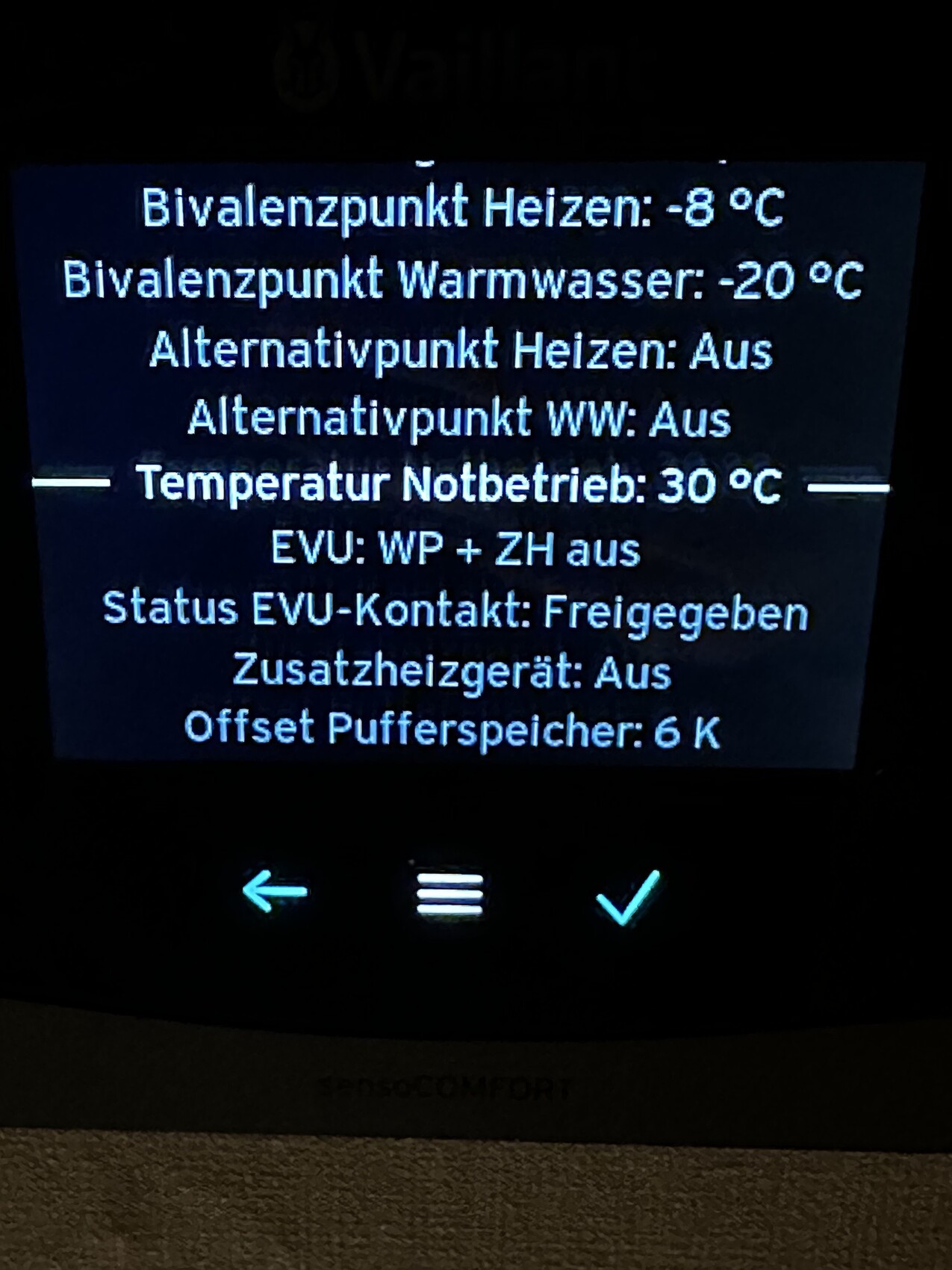 Display zeigt Heiz- und Warmwasser-Punkte, Notbetrieb 30°C, EVU-Freigabe, Speicher-Offset 6 K
