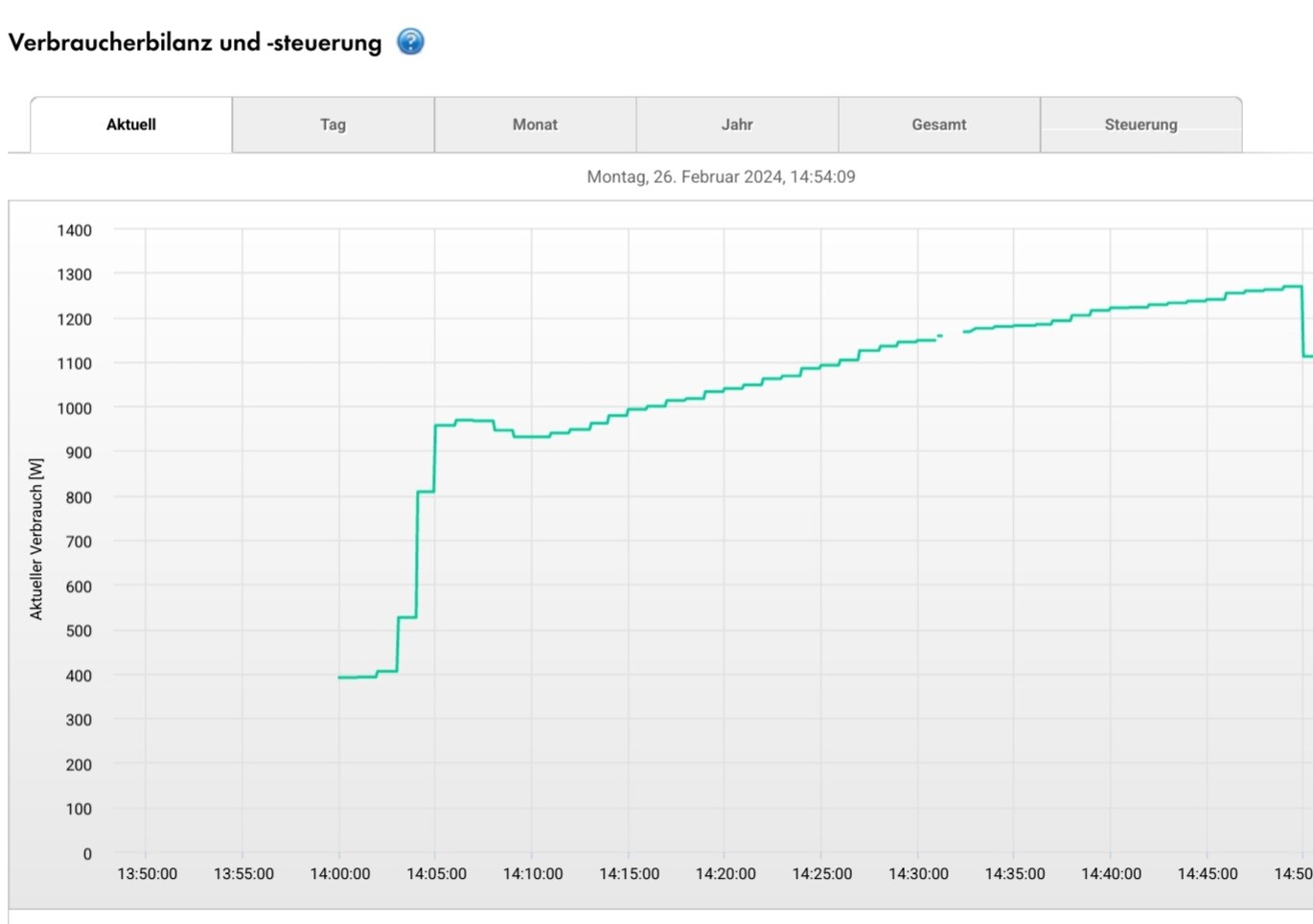 Die Kurve ist bei "Normal" Einstellung? Bei mir läuft die mit ""Normal" von Anfang an mit 100% und wird die letzten 5-10min "langsamer"Ja richtig mit der Einstellung "Normal".Hier mal ein Screenshot aus 2022 mit der Einstellung "Eco". Wie ich geschrieben habe waren es zum Ende der Warmwassererzeugung Eco knapp über 1000 W. Bei dem jetzigen Beispiel kenn ich nur die Zieltemperatur 45°. Ausgangstemperatur zur Warmwasserzeugung war vermutlich etwa 38°.