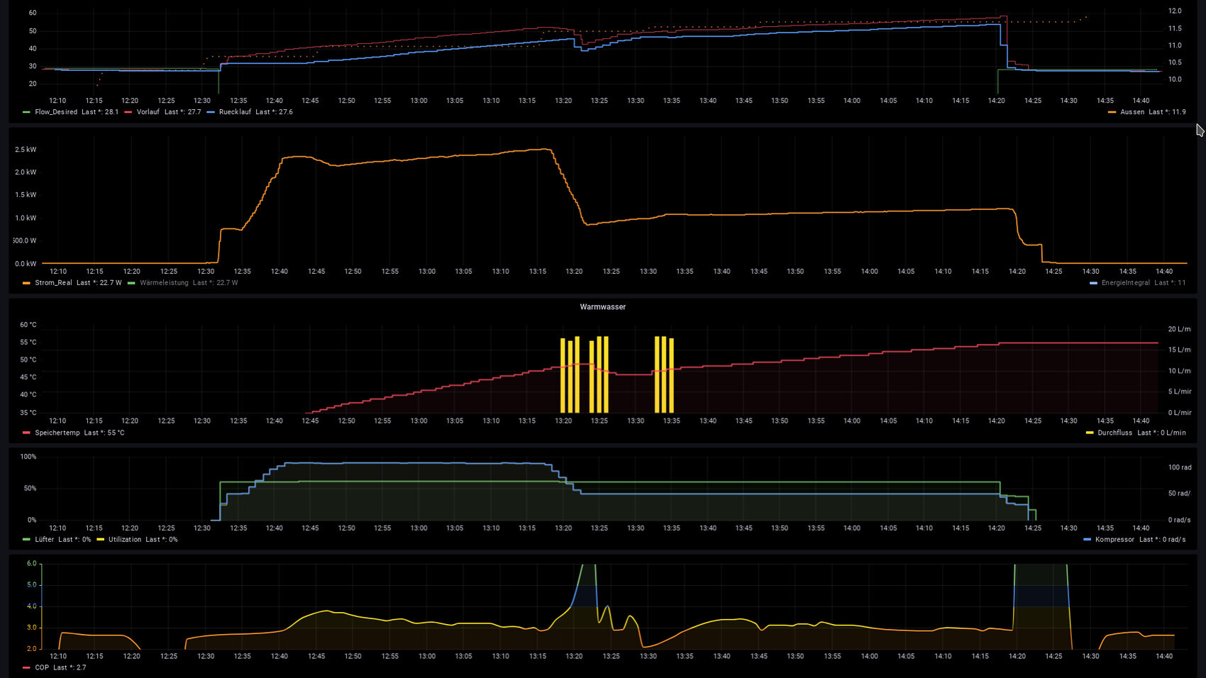 Ich ergänze mal noch um eine Korrektur. Bei Normal/Balanced wird nicht mit mehr Temperaturerhöhung gearbeitet. Das ist Quatsch. Der Offset hat sowieso eigentlich kaum Auswirkungen. Bei mir (Hydraulikstation, 300l AllStor für Warmwasser/ Trinkwasserstation) sehe ich sogar gar keine Auswirkungen. Der Warmwasser-Modus hört exakt bei Erreichen der Speichertemperatur auf. Dabei ist die Rücklauf meißtens ähnlich der Speicher-Temp. Die Vorlauf ist eigentlich immer so ca. 3 Grad höher, egal welcher Offset eingestellt ist. Ich nutze im Winter meißtens Balance. Da geht der Kompressor nur am Anfang fast auf Volllast, geht dann aber aber zurück auf 42%. Evtl. ist die Zeit des runter drehens Abhängig vom Offset. Man kann sehen, dass sobald sich die Spreiziung verringert sich dann auch die Kompressordrehzahl verringert.@cyberthom hatte in der Vergangenheit das Thema Warmwasser mit den 3 Einstellungmöglichkeiten anhand seiner graphischen Darstellung recht ausgiebig beschrieben. Daran hat sich m.E. nichts geändert. Leider ist unser Thema schon so aufgebläht, dass es schwierig ist mit dem Lesen der alten Beiträge. Vielleicht findet @cyberthom seine Aufzeichnungen?