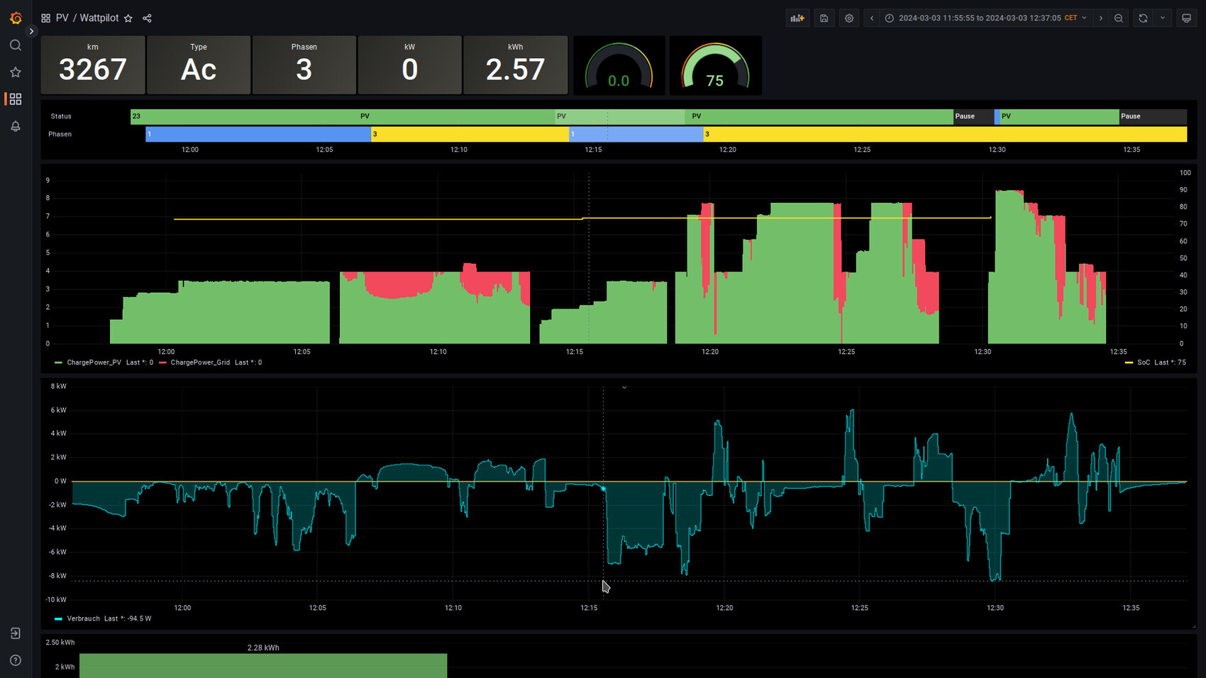 Aber seit Dezember habe ich zusätzlich den 12,8 kWh Speicher in Betrieb. Die Ladung erfolgt mit deutlich weniger Bezug (fast Null) aus dem Netz. Die Steuerung des SMA Hybrid-Wechselrichter ist viel schneller, der Speicher glättet den Strombezug aus dem Netz. Bei der Nutzung einer EEBUS Strategie und wechselnder Bewölkung kann ich mir ein ähnliches Verhalten vorstellen. Aber hier kommen wir in die Diskussion zur notwendigen Größe einer Photovoltaikanlage und Speicher für die Nutzung in der kälteren Jahreszeit.Also ich wollte auf keinen Fall unfair wirken. Ich hab da mit Euphorie dann wohl den falschen Begriff verwendet. Aber ich denke es ist rüber gekommen was ich meinte. Zum Thema Wallbox und Photovoltaik. Ich finde das ist eigentlich eine gute Kombination, da sich die Wallbox eigentlich sehr gut auf die Bedingungen einstellen kann. Bei mir dauert die Umstellung 1-phasig auf 3-phasig 20 Sekunden. Bin mir nicht sicher, ob das Auto- (Skoda Enayaq) oder WB-abhängig ist (habe den Wattpilot). Aber klar, wenn man gerade auf 3-phasig umschaltet und dann die Sonne weg ist, wird erst einmal weiter geladen (je nachdem was als Mindest Ladedauer für 3-phasen eingestellt ist. Bei mir sieht das dann so aus (Grafik über Hrafana):